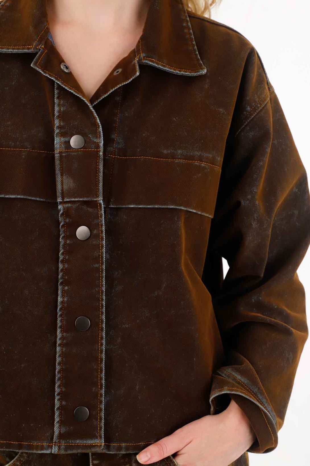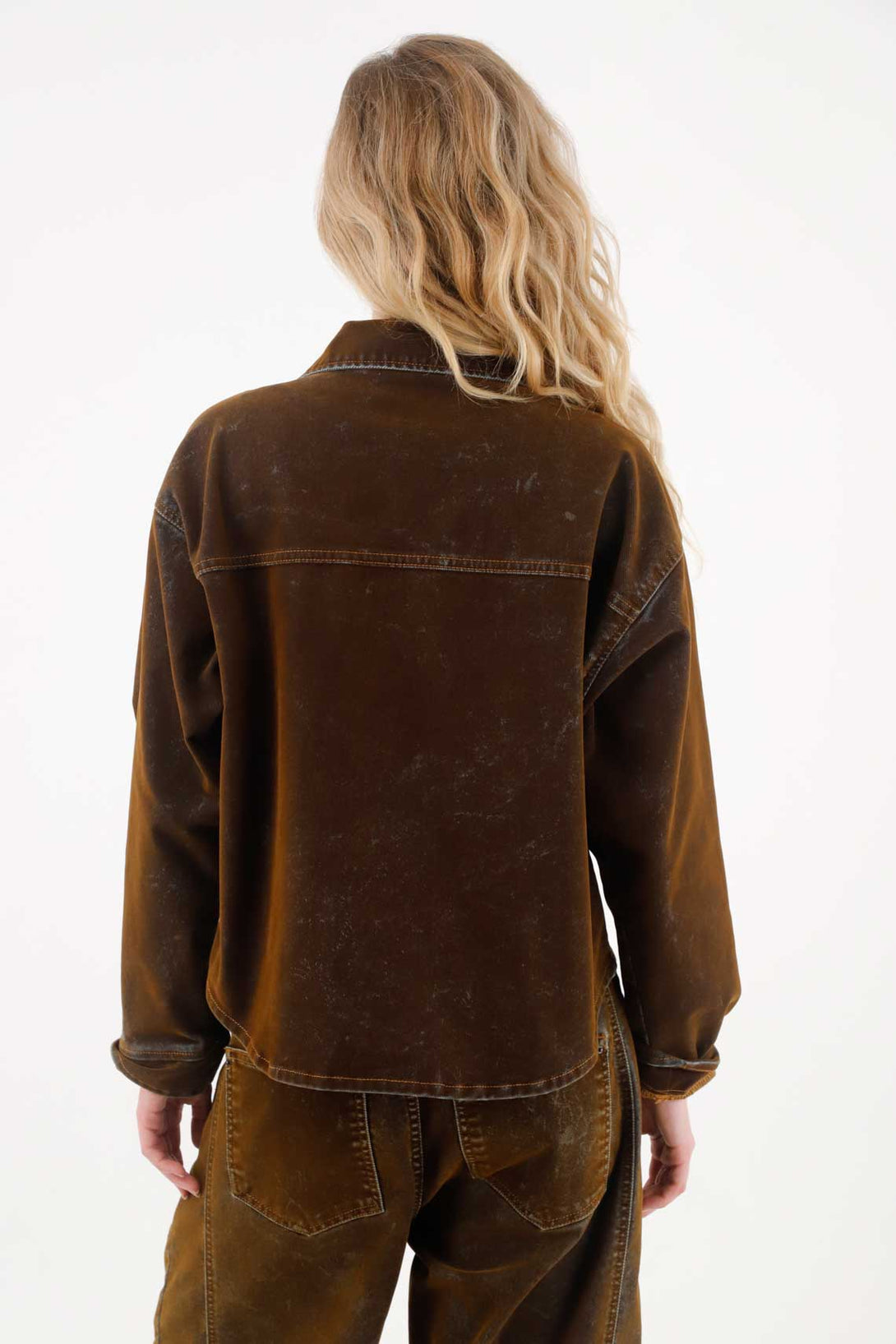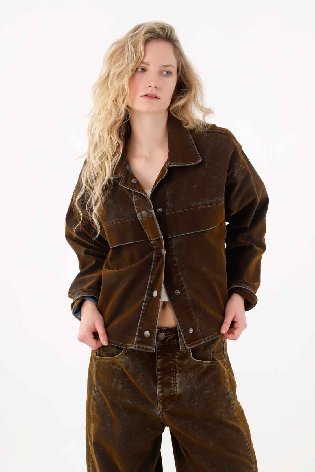 Inspirada en la silueta trucker clásica, esta chaqueta eleva el estilo utilitario con un toque sofisticado gracias a su textura en velvet. Su caída pulida y el brillo sutil del material la convierten en la opción perfecta para looks de transición: con denim para el día o con faldas y botas para un aire más refinado.