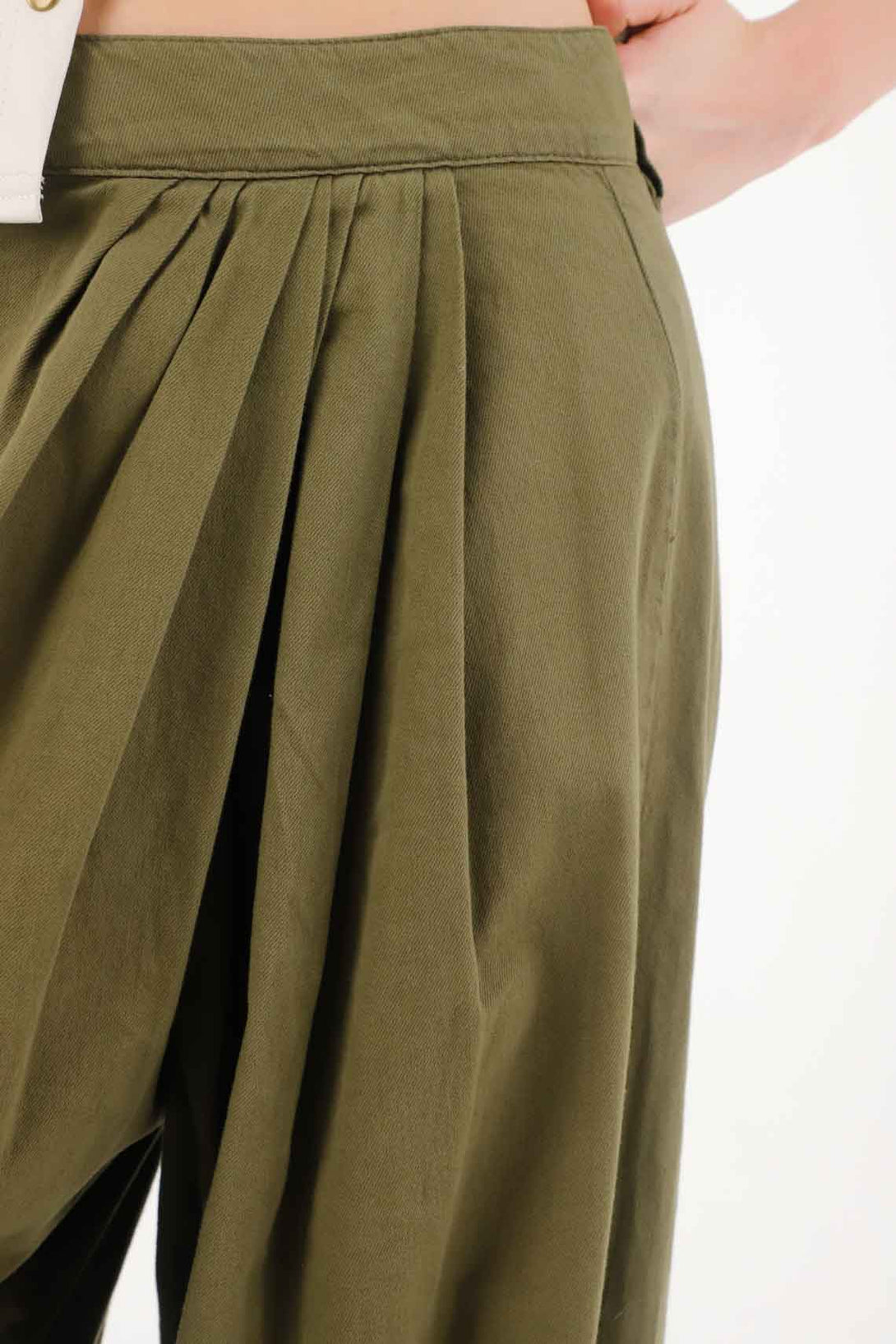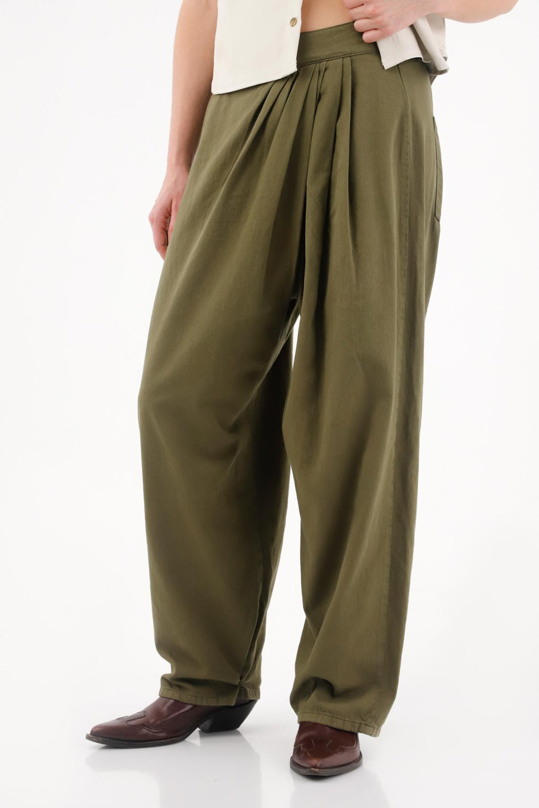 Este pantalón amplio en drill liviano combina una silueta relaxed con drapeados frontales que aportan movimiento y sofisticación a tu look. La pretina con botonadura lateral suma un detalle de estilo único, perfecto para destacar.