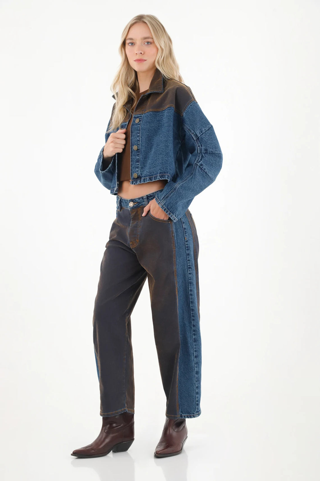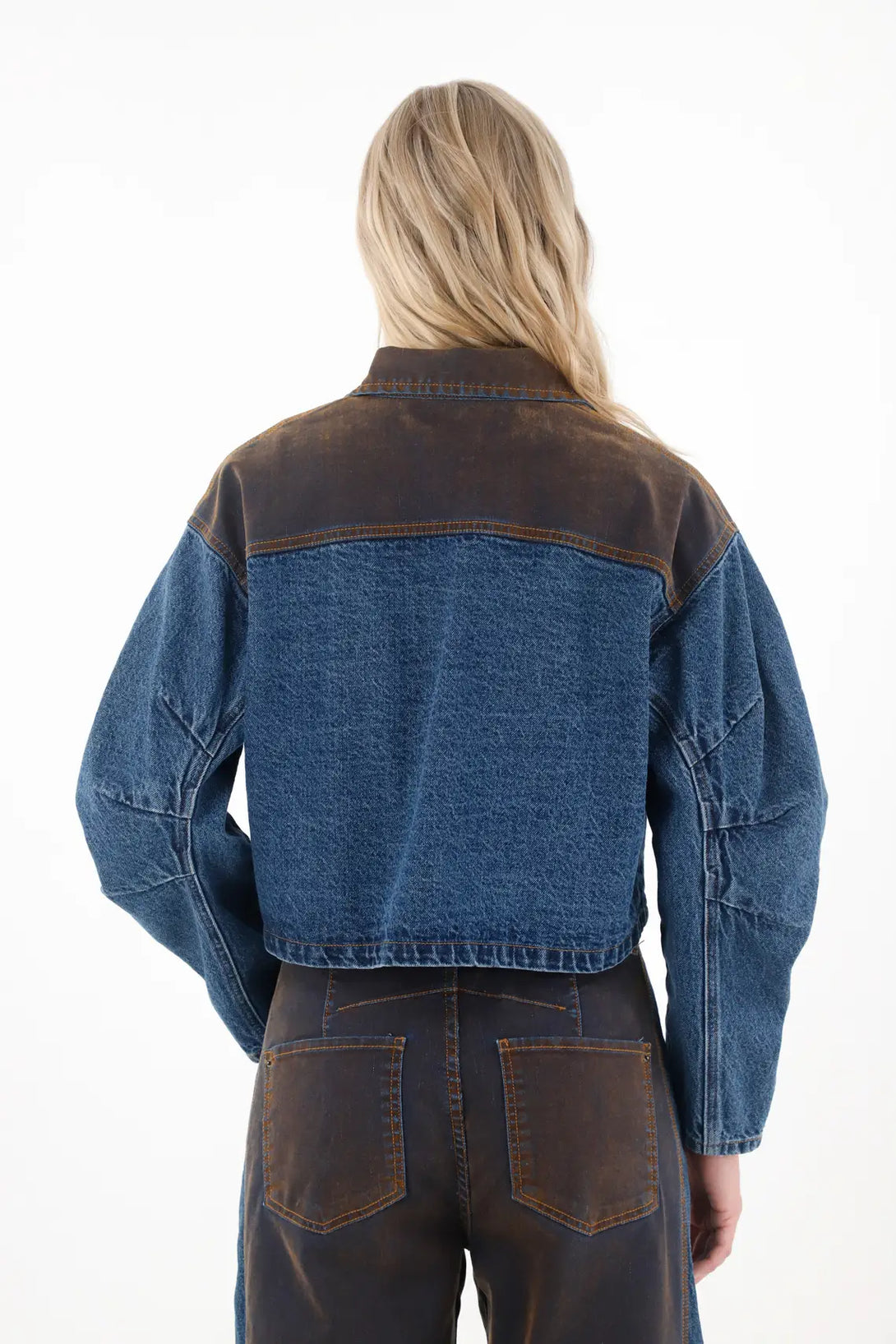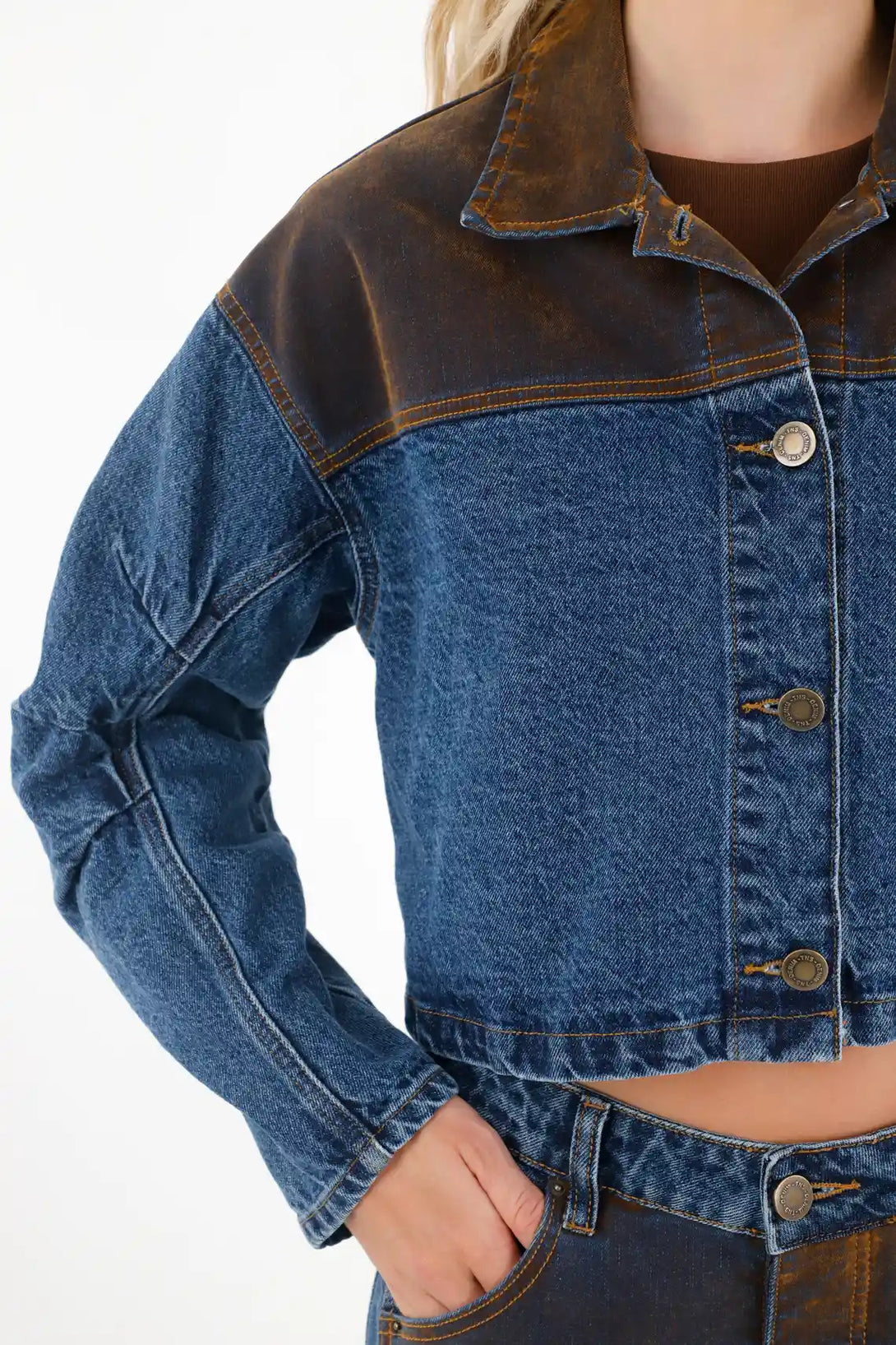 This jacket elevates classic denim with a sophisticated twist: velvet appliqués on the collar and waistband contrast with delicate stone, adding texture and subtle shine. Its cropped silhouette and horseshoe sleeves create a modern, characterful fit, ideal for pairing with high-waisted pants or fitted dresses.