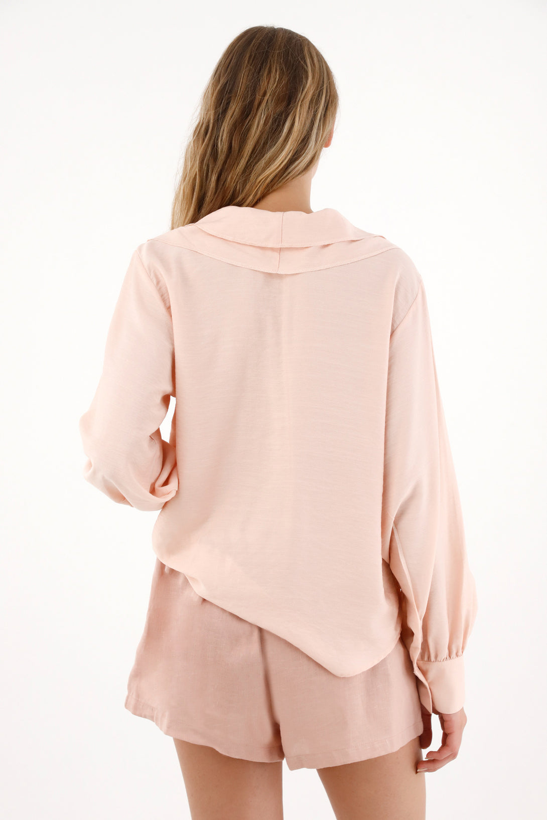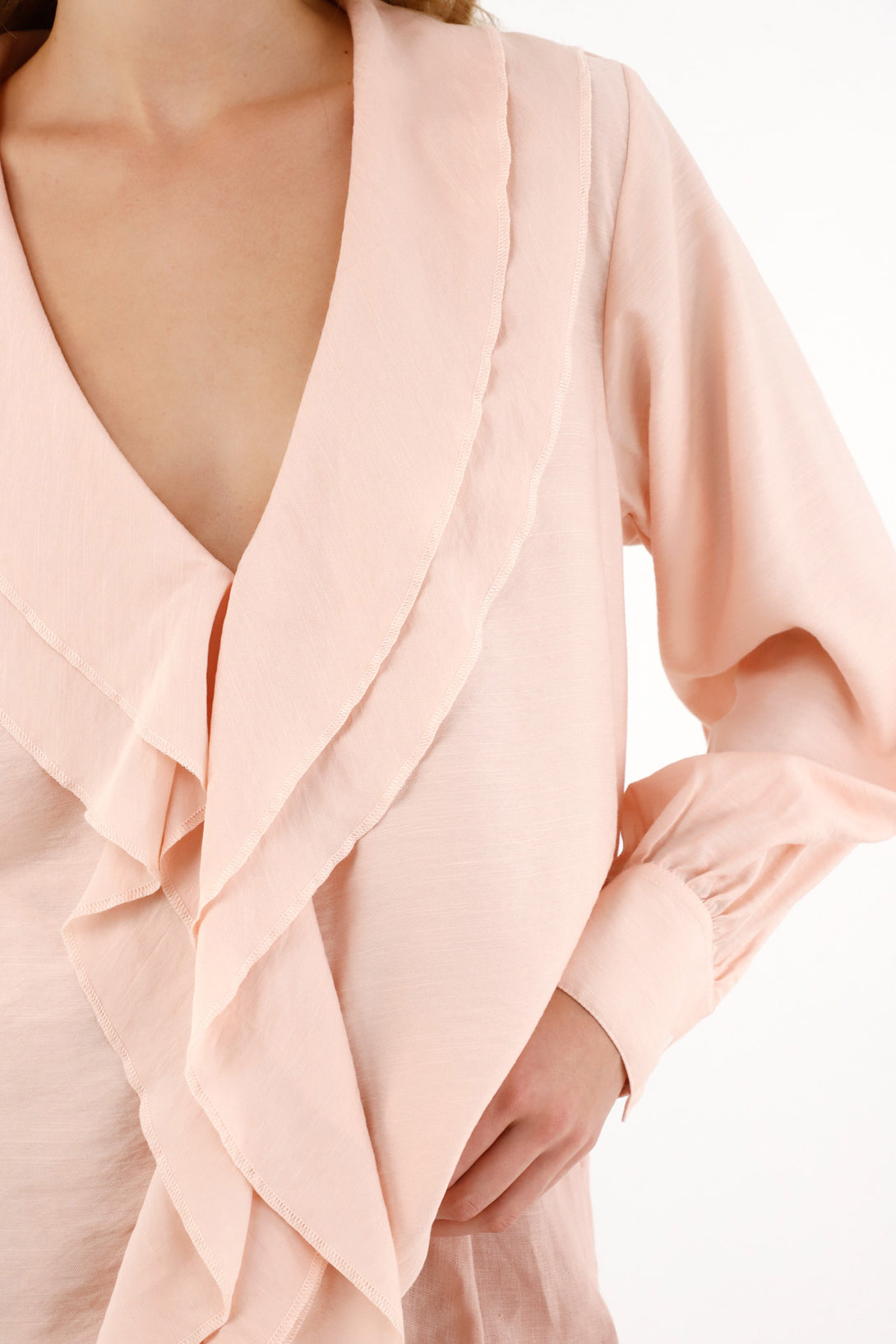 Discover endless styling possibilities with this lightweight blouse! It exudes a relaxed and feminine vibe that captures all the attention, thanks to its cascading ruffles and deep V-neck that adds a touch of delicacy to your look.